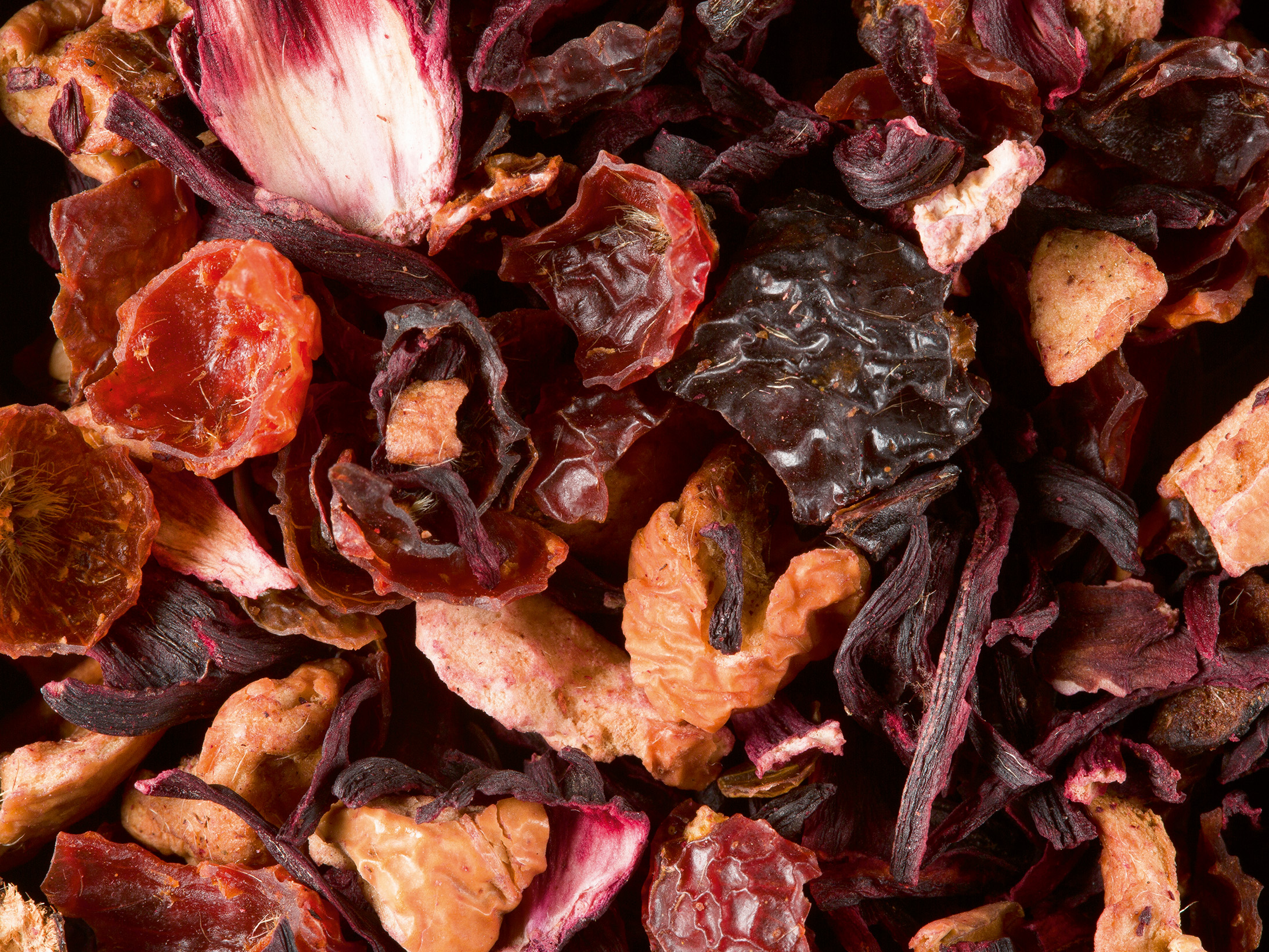Mélange de fleurs d’hibiscus, de morceaux de pomme, de cynorrhodon, arômes framboise, fraise et crème.