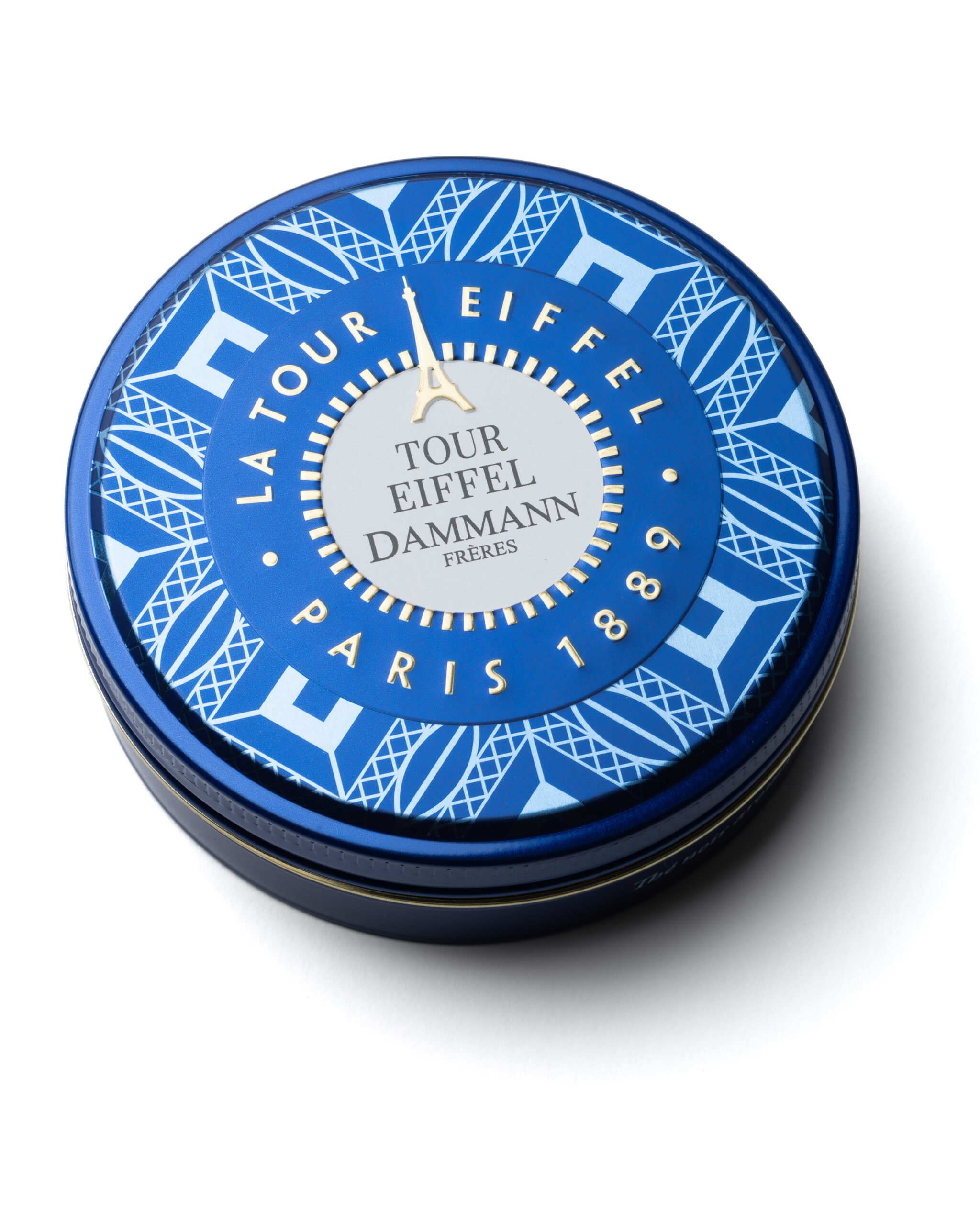 «Écrin bonbonnière» aux reflets bleu changeants, qui fait vibrer, au cœur d’un motif inspiré de la remarquable architecture de fer, la silhouette et la signature de la Tour Eiffel.